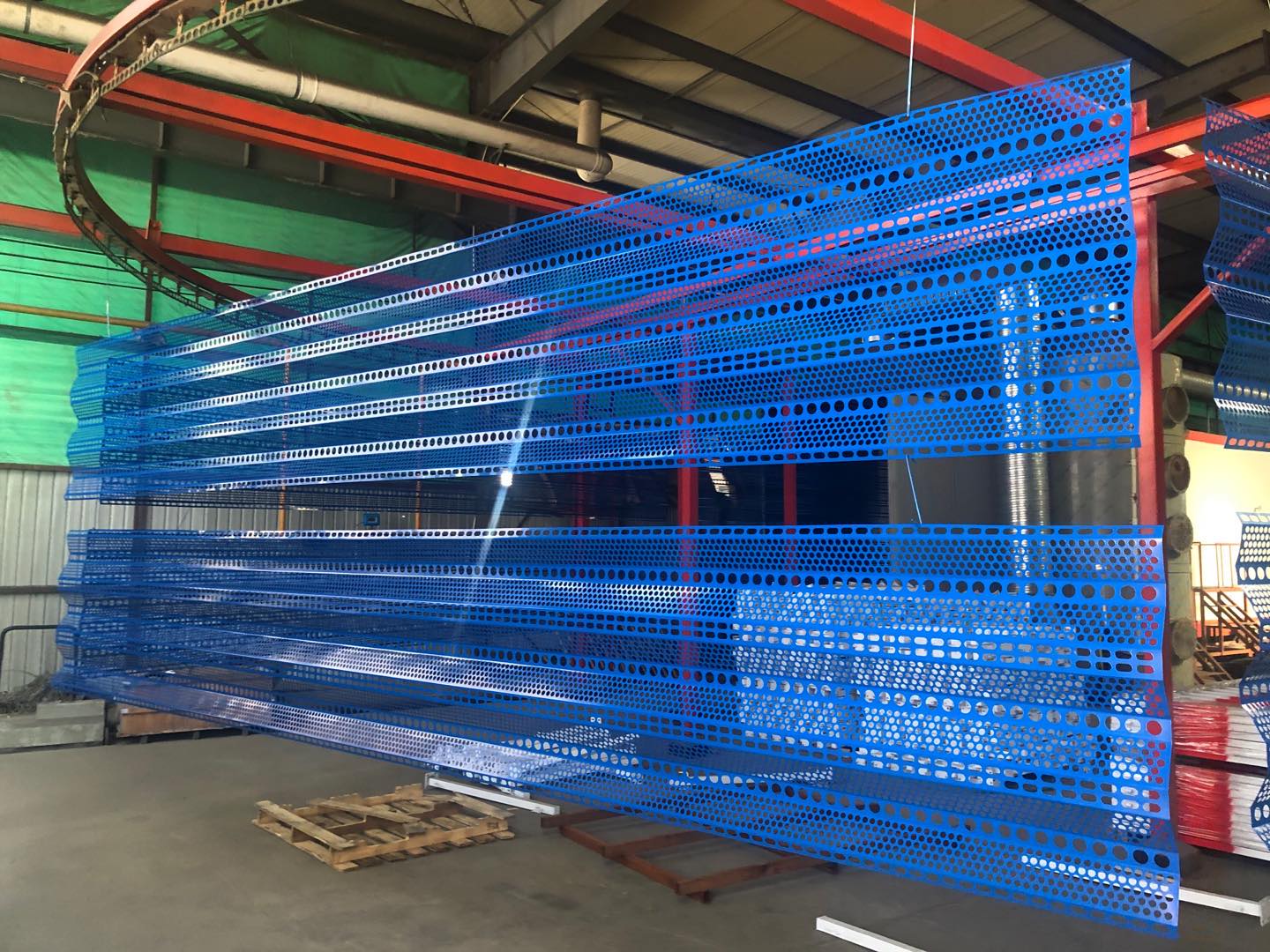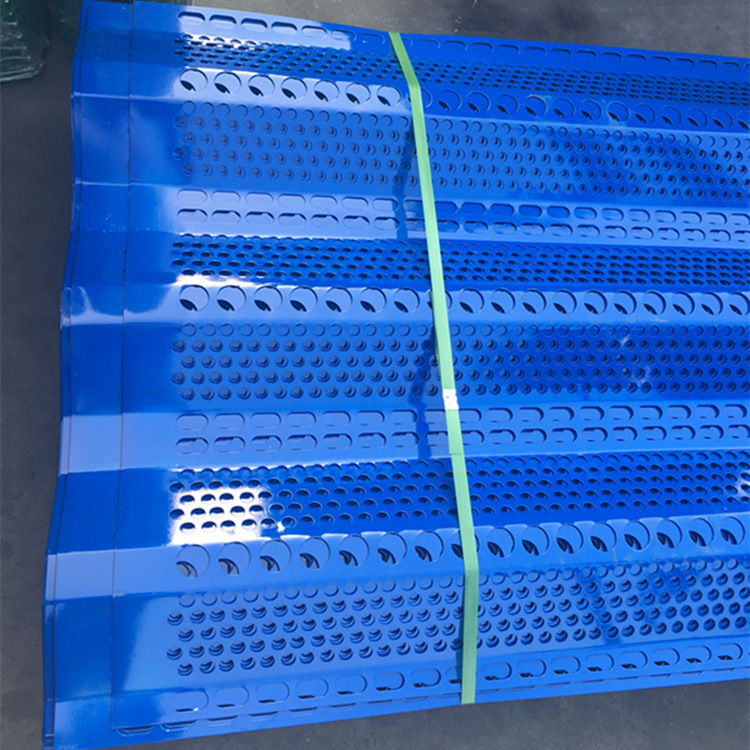 防風(fēng)抑塵網(wǎng)是利用空氣動(dòng)力學(xué)原理,按照實(shí)施現(xiàn)場環(huán)境風(fēng)洞實(shí)驗(yàn)結(jié)果加工成一定幾何形狀、開孔率和不同孔形組合擋風(fēng)抑塵墻,使流通的空氣(強(qiáng)風(fēng))從外通過墻體時(shí),在墻體內(nèi)側(cè)形成上、下干擾的氣流以達(dá)到外側(cè)強(qiáng)風(fēng),內(nèi)側(cè)弱風(fēng),外側(cè)小風(fēng),內(nèi)側(cè)無風(fēng)的效果,從而防止粉塵的飛揚(yáng)。