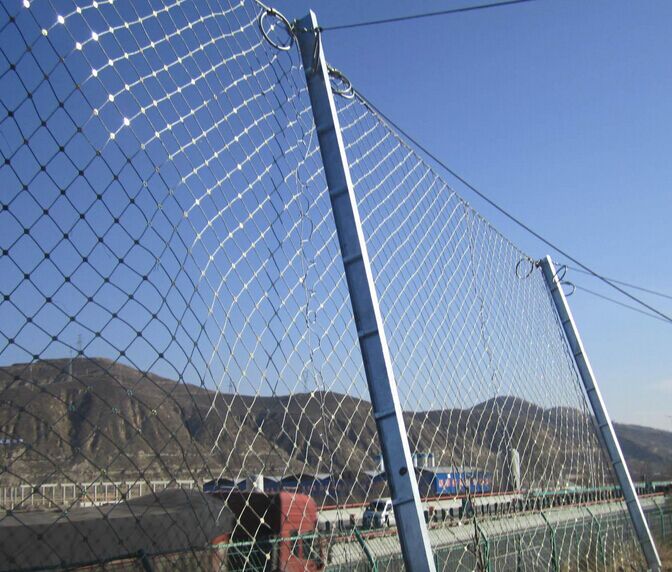 被動(dòng)邊坡防護(hù)網(wǎng)是由鋼絲繩網(wǎng)、環(huán)形網(wǎng)、(需攔截小塊落石時(shí)附加一層鐵絲格柵)、固定系統(tǒng)(錨桿、拉錨繩、基座和支撐繩)減壓環(huán)和鋼柱四個(gè)主要部分構(gòu)成。鋼柱和鋼絲繩網(wǎng)連接組合構(gòu)成一個(gè)整體,對(duì)所防護(hù)的區(qū)域形成面防護(hù),從而阻止崩塌巖石土體的下墜,起到邊坡防護(hù)作用。
